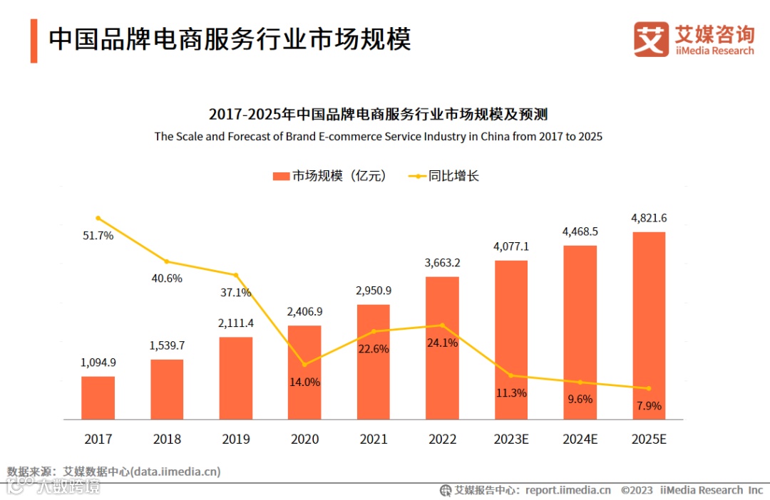 数据显示,2022年中国品牌电商服务行业市场规模为3663.2亿元,同比增长24.1%,预计2025年将达到4821.6亿元。艾媒咨询分析师认为,目前电商市场服务需求不断增长,随着服务商数智化能力的构建及全链式服务体系的完善,品牌电商服务市场规模将进一步扩大。