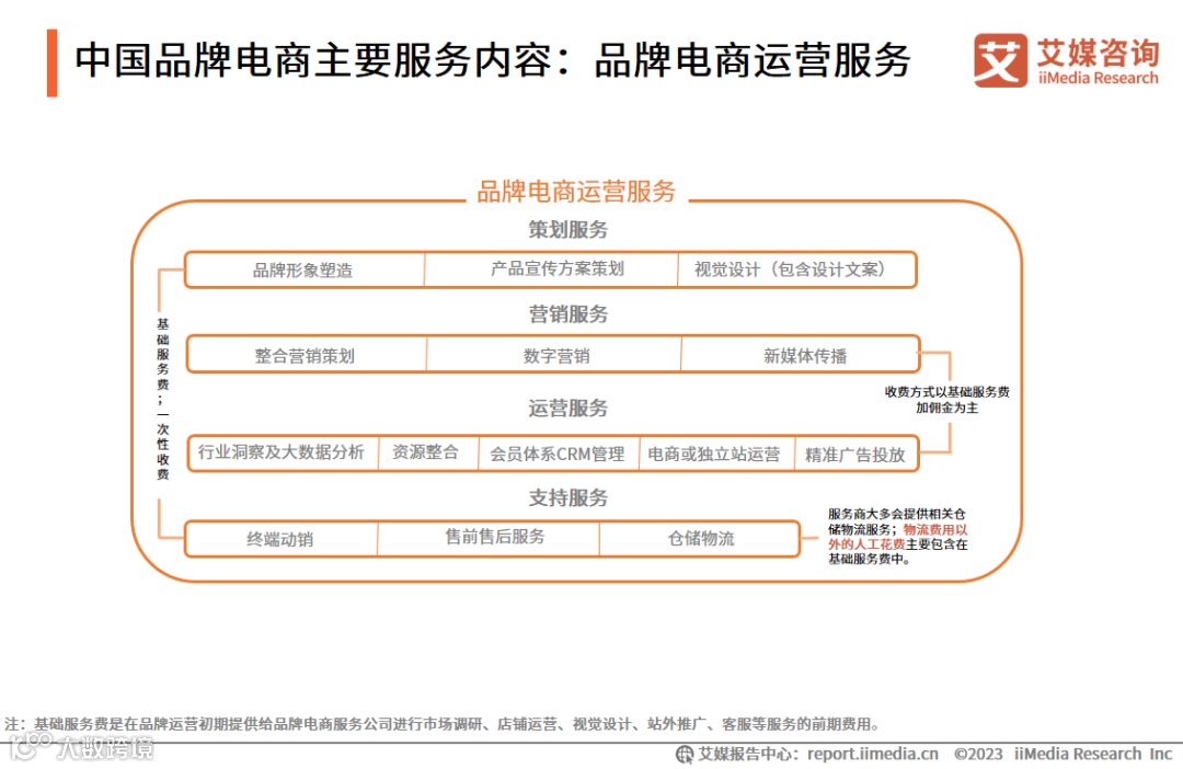 中国品牌电商服务内容主要通过四大板块实现,即策划服务、营销服务、运营服务、支持服务。其中创意先行,服务商依据不同的品牌特色进行针对性的品牌形象塑造、产品宣传方案策划,再根据策划设计方向进行中期全方位的运营。运营服务一般涉及行业洞察及大数据分析、电商或独立站的运营、会员体系 CRM 管理等。当前营销服务及运营服务的收费方式主要以“佣金+基础服务费”形式为主。