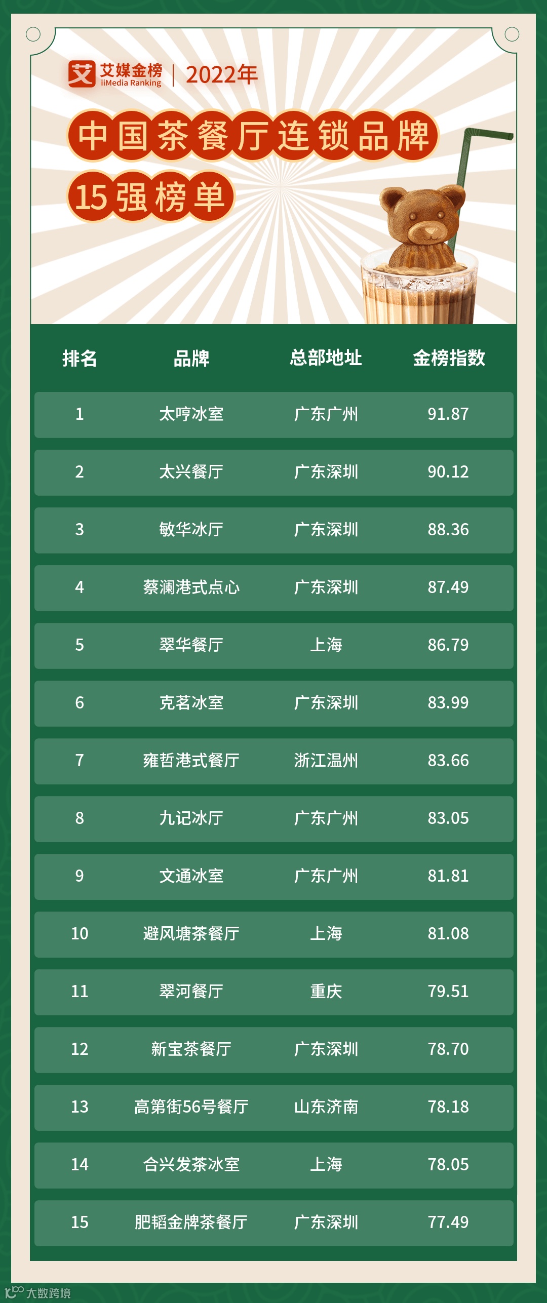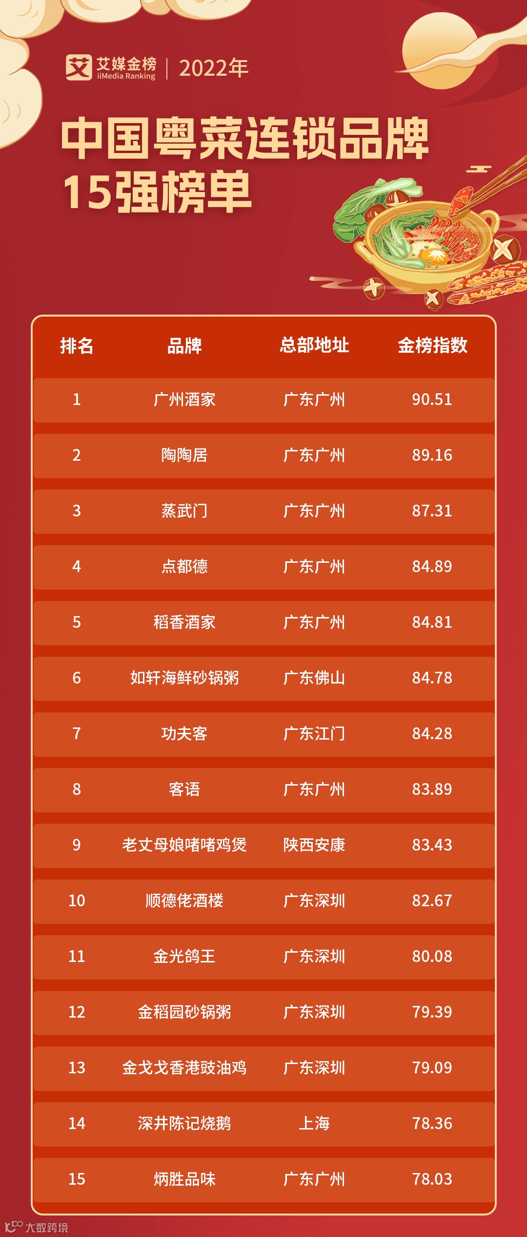 广州酒家、陶陶居、海底捞、小龙坎、瑞幸、谭鸭血、喜茶、蜜雪冰城、茶颜悦色、虎头局·渣打饼行、老乡鸡、乡村基、探鱼烤鱼、炉鱼、正新鸡排、茶百道、书亦烧仙草、奈雪の茶、五爷拌面、西贝莜面村、和府捞面、遇见小面等数十家企业均榜上有名。