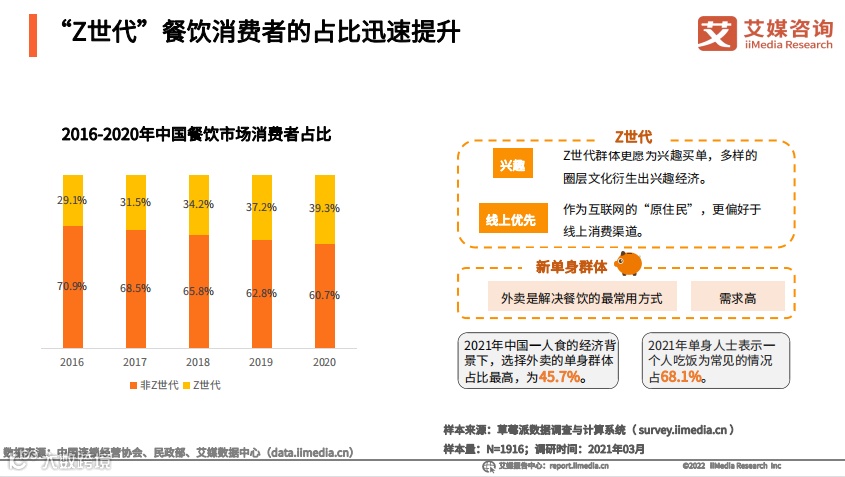 值得注意的是,数据显示,餐饮消费者中“Z世代”,由2016年的29.1%提升至2020年的39.3%,他们更愿意为兴趣买单,喜好线上外卖点单。可见,在消费升级以及Z世代崛起的背景下,新一代消费者在饮食消费上有了更进一步的需求,成为商家必争的新客群。餐饮企业应正视餐饮需求端带来的新变化,通过外卖等形式,不断丰富餐饮消费场景和行业业态。