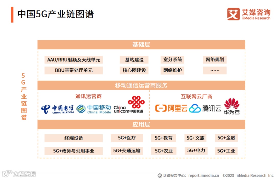 5G产业链上游为基础层,主要包括网络规划、基站建设、传输网、承载网以及核心网建设等移动通信基础设施;中游是移动通信运营商服务;下游应用层主要为日常接触到的手机、汽车等终端设备及应用场景。