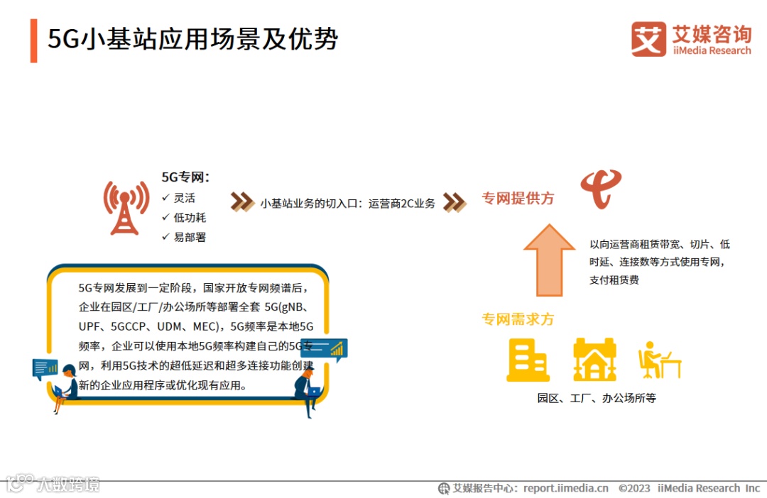 截至2023年2月末,中国5G基站总数达238.4万个,预计2025年将突破360万个。中国5G建设组网方式以“宏基站为主、小基站为辅”,随着宏基站站址建设趋向饱和,未来小基站将成为市场焦点。艾媒咨询分析师认为,小基站能降低部署成本,解决弱信号和盲区的网络覆盖问题,在行业专网市场、MEC上层应用极具优势,将成为5G时代重要的组成部分。随着远程办公、在线教育、在线医疗等5G室内应用场景更加多元化,各大设备厂商和运营商积极抢滩部署,5G小基站将迎来大规模发展期。