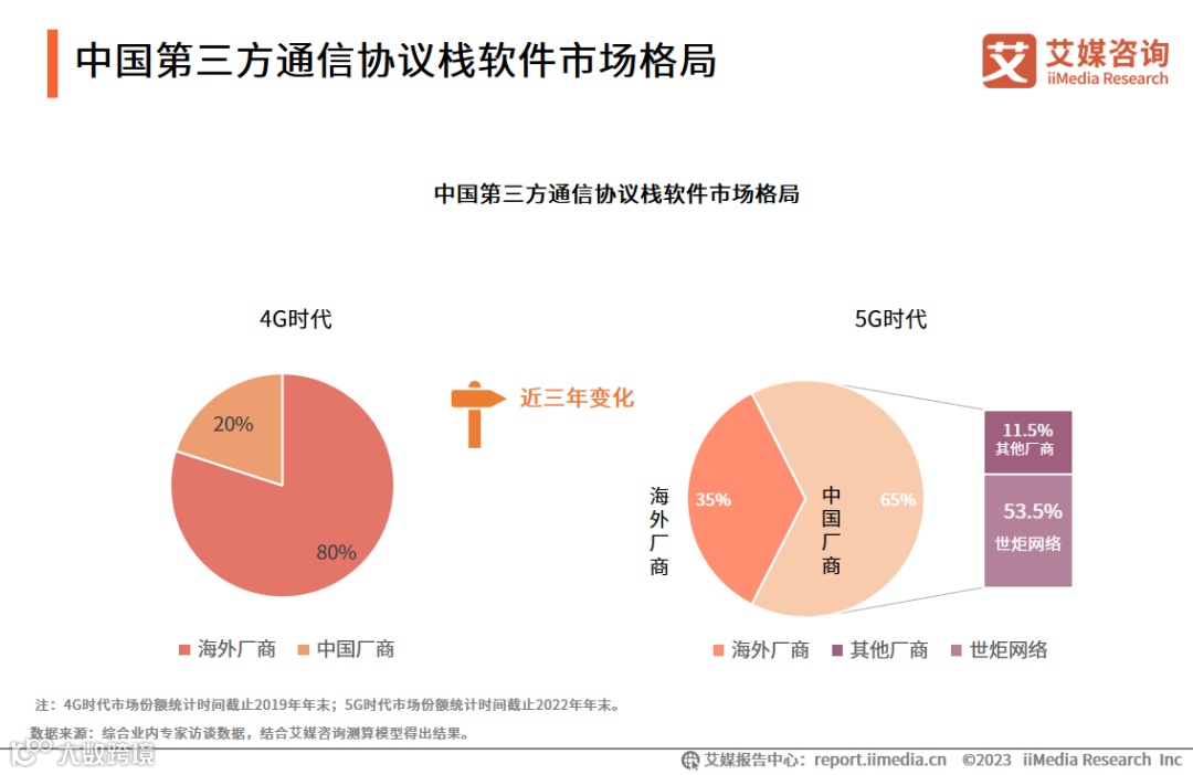 在4G时代及之前,中国第三方通信协议栈软件服务厂商以海外企业为主,外国软件厂商占据国内约80%的市场份额。随着中国5G市场的快速发展,越来越多客户更加注重中文本地化、国产化,中国通信解决方案提供商在通信协议栈方面的技术实力和创新能力日益增强,中国电信运营商、设备制造商、软件提供商之间建立了紧密的合作伙伴关系,给外来企业发展带来了一定的竞争压力。以世炬网络为代表的中国第三方通信协议栈软件厂商开始冒头,并逐渐占据主要的市场份额。