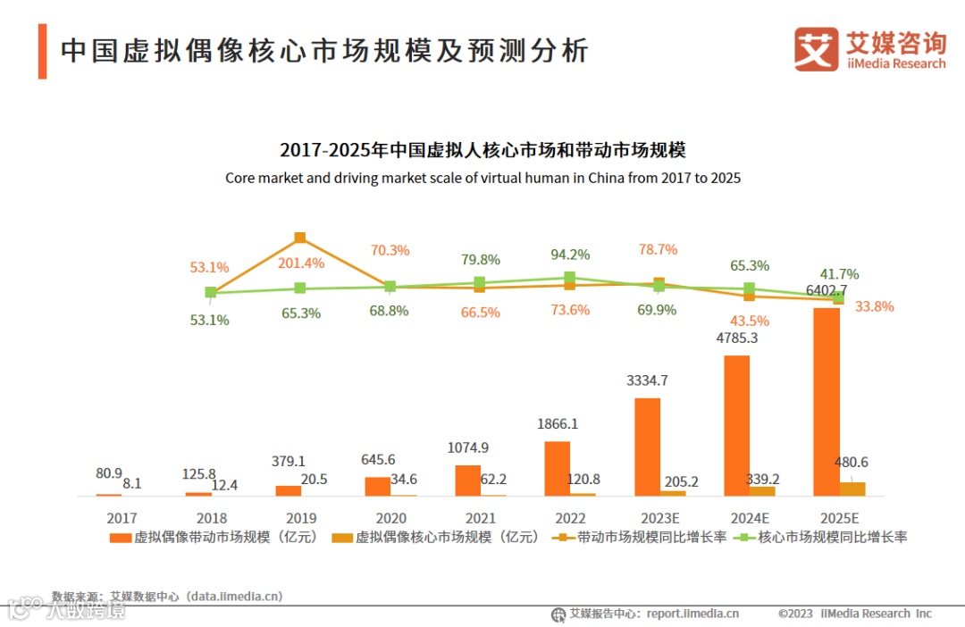 iiMedia Research(艾媒咨询)数据显示,2022年中国虚拟偶像核心市场规模为120.8亿元,预计2025年将达到480.6亿元;2022年虚拟偶像带动周边市场规模为1866.1亿元,预计2025年为6402.7亿元。艾媒咨询分析师认为,虚拟偶像在内容和周边产品产出方面有着较强的可塑性,能根据时代潮流发展不断开发新的爆点,因此行业增长的延续性较强,未来一段时间内都将保持稳定增长态势。