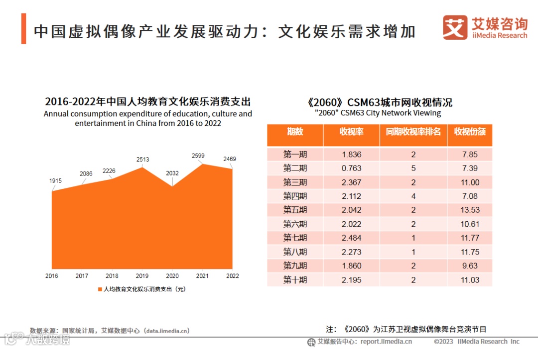 随着人们生活水平的提高、文化消费观念的转变,以及政府对文娱产业的日益重视,文娱产业市场需求呈现多元化趋势,文娱消费不断提高。数据显示,2022年全国居民人均教育文化娱乐支出2469元,比2016年增长28.93%。居民对文化娱乐方面的需求不再限制于真人的偶像制作,打破了偶像与虚拟艺人的次元壁,各平台开始搭建AI虚拟偶像选秀平台,让更多的虚拟偶像走入大众视野。