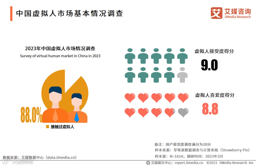 iiMedia Research(艾媒咨询)数据显示,有八成以上的被调查群体接触过虚拟人;其中市场对虚拟人的接受度得分为9.0分,对虚拟人的喜爱度为8.8分。艾媒咨询分析师认为,虚拟人的应用已逐渐突破次元壁,虚拟和现实之间的相互交织,为市场开辟了一块属于虚拟生态的空间,虚拟文化也开始被大众接受。