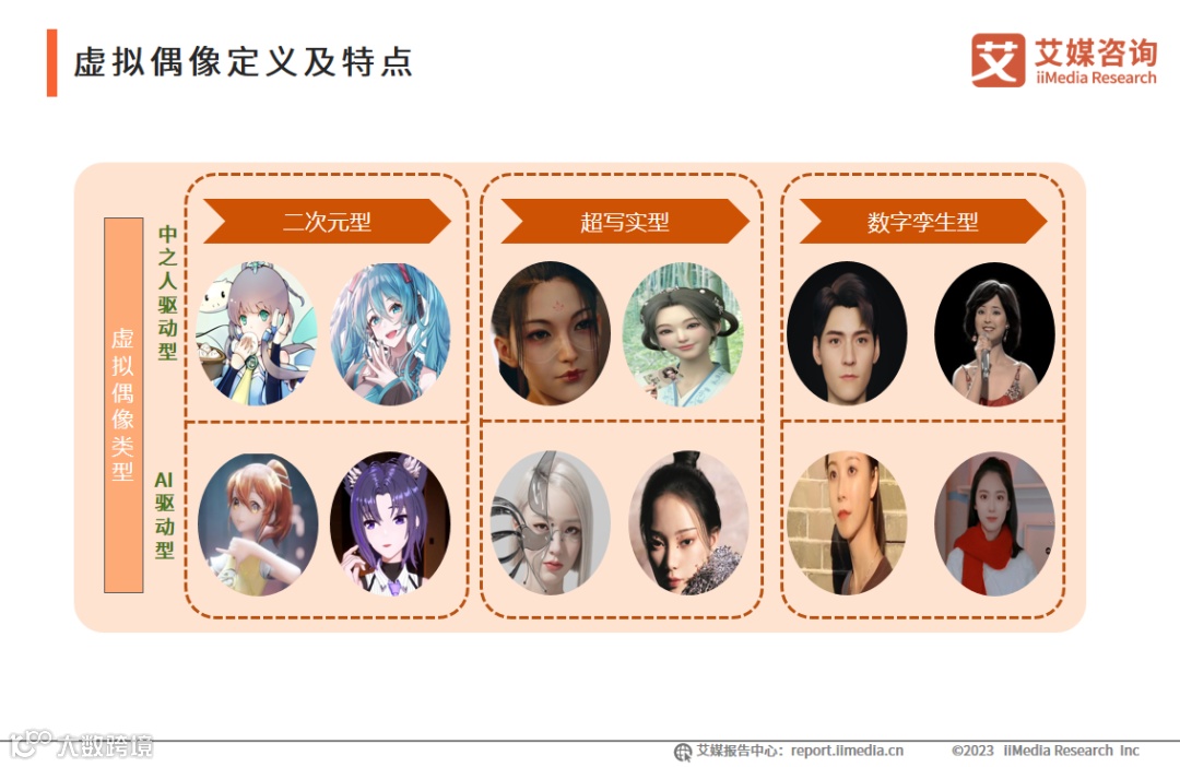 虚拟偶像是指通过绘画、动画、CG等形式制作,并赋予专属的人设、声音、性格,依托网络等虚拟场景或现实场景进行各类活动的人物形象。根据视觉风格,虚拟偶像可分为三种类型:二次元型、超写实型和数字孪生型。二次元虚拟偶像的视觉形象偏向动漫风格,超写实虚拟偶像则更类似真人;而数字孪生型是在一个物理实体基础上,通过数字技术创造出的一个虚拟“数字分身”。在此分类基础上,按照驱动方式分类可以分为AI驱动型和中之人驱动型。AI驱动是指虚拟形象和音频均以人工智能合成;中之人驱动的虚拟形象是借助捕捉技术,对中之人进行语音、动作、面部捕捉后合成的。