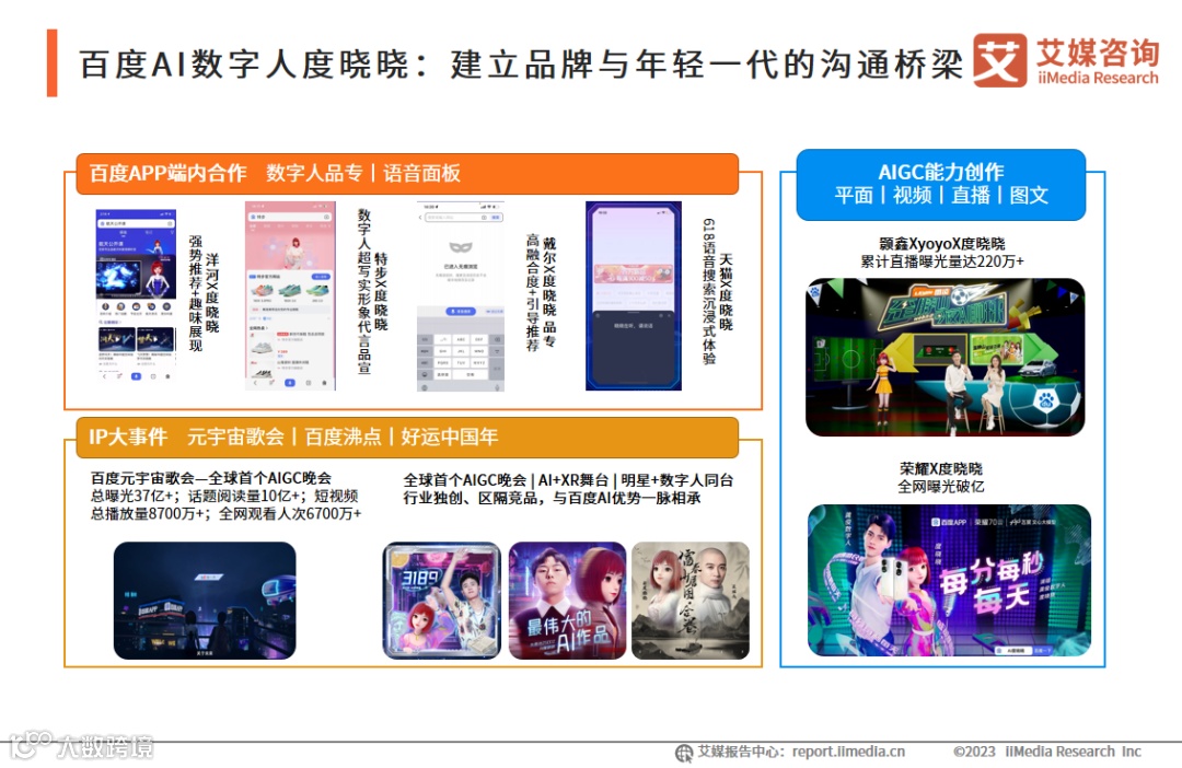 在度晓晓的商业应用方面,百度提供多种合作模式,主要有百度APP端内合作、IP大事件、AIGC能力创造等,为合作品牌提供新的流量密码,帮助品牌建立与年轻人的沟通桥梁,在数字化升级中实现营销增长。