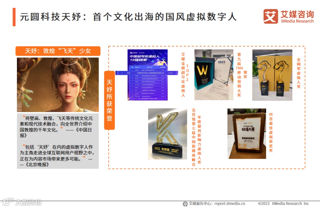 2022年4月22日,元圆科技天妤正式出道,成为首个文化出海的国风虚拟数字人。她以收集壁画碎片为线索,发布系列正片及番外内容,向世界讲述中国传统文化的故事,在海内外产生了热烈反响。在海外平台,天妤粉丝已突破11w,总播放量突破120w,“天妤仿妆”还引起海外美妆达人的竞相模仿。目前,天妤全网粉丝超550w,视频播放量超4亿,抖音点赞量近3000w,相关话题播放量破9亿。