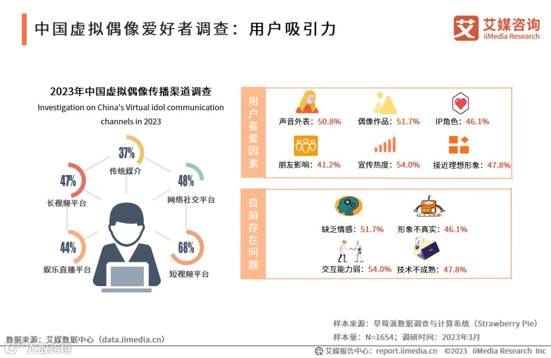 iiMedia Research(艾媒咨询)数据显示,虚拟偶像在短视频平台以及网络社交平台传播最为广泛,有超过一半的网民被虚拟偶像的外形声音、作品以及宣传吸引,但虚拟偶像的交互能力以及情感的欠缺是目前阻碍行业发展的痛点。艾媒咨询分析师认为,虚拟偶像的人设以及外表经过精心设计再加上适当的宣传,符合作品传播和内容变现的所需条件,但相关企业仍需在用户的交互体验和情感需求上作出突破。