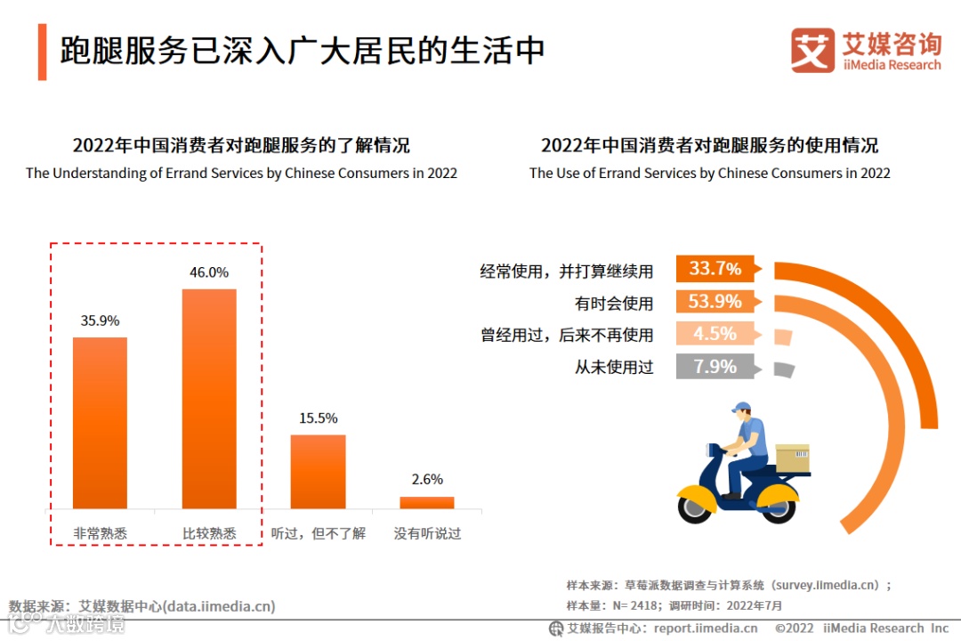 调研数据显示,81.9%的消费者对跑腿服务较为熟悉;33.7%的消费者经常使用跑腿服务,并打算继续使用;53.9%的消费者有时会使用跑腿服务。艾媒咨询分析师认为,紧随快递、外卖的脚步,跑腿服务满足了消费者的多样化、个性化需求,已深度渗入到广大居民的生活中。