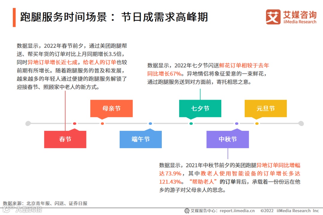 受节日送礼物需求影响,春节、母亲节、端午节、七夕节、中秋节等节日成为跑腿需求的高峰期。众多消费者通过跑腿服务来帮送礼物、帮办事,在重要节日传递心意。