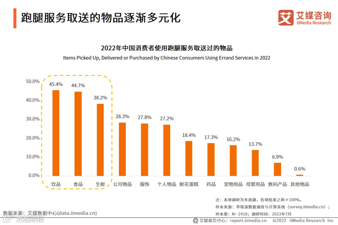 调研数据显示,消费者使用跑腿取送过的物品占比第一是饮品,占比为45.4%;其次是食品,占比44.7%;生鲜品类排名第三,占比38.2%。艾媒咨询分析师认为,餐饮生鲜目前仍是跑腿服务取送的主流品类,主要包括个人取送和个体经营者发货需求,同时公司物品、个人物品、鲜花蛋糕、宠物用品等占比也在上升,跑腿服务取送的物品逐渐多元化。