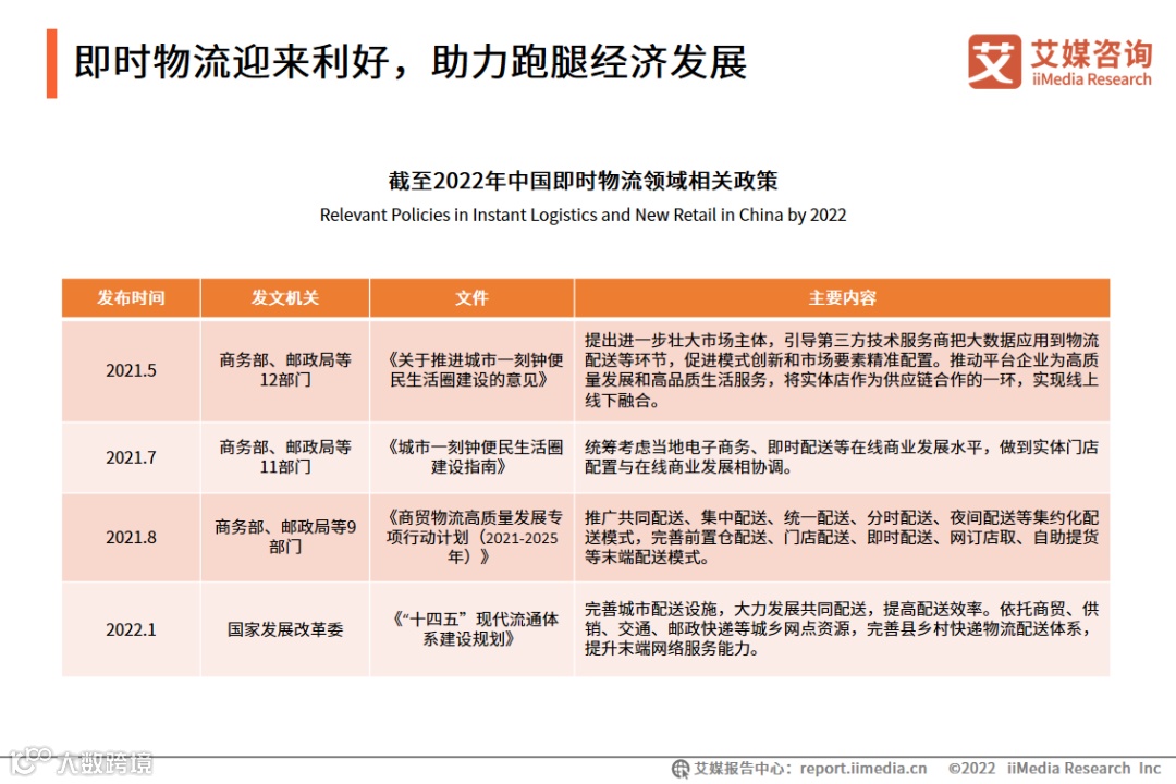 2021年-2022年,我国相继出台若干项支持即时物流发展的政策措施,旨在推动线下与线上高度融合发展,促进模式创新和市场要素精准配置,完善末端配送体系,提升末端网络服务能力。艾媒咨询分析师认为,跑腿作为同城服务行业增速最快的新兴赛道之一,在应对多元化消费需求中迭代发展,即时物流相关政策措施的实施将进一步促进跑腿经济多元化发展。