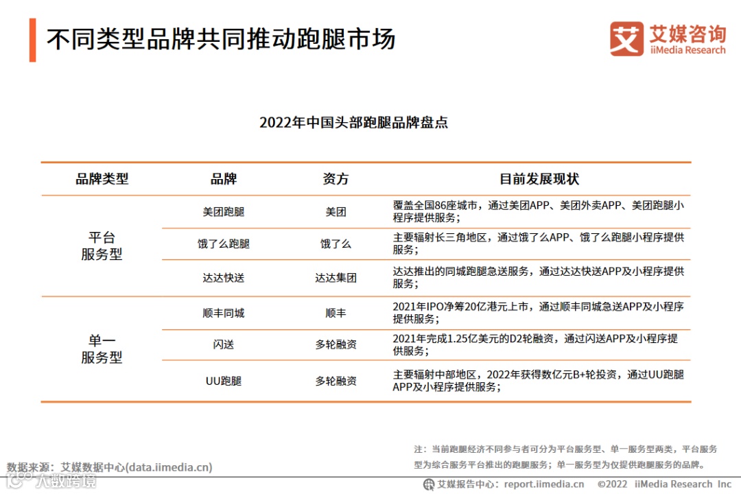 目前,根据中国跑腿服务提供者的类型,将市场参与者分为两类:平台服务型,为综合服务平台衍生出的跑腿服务,如美团跑腿、饿了么跑腿,能借助平台丰富商流及运力规模优势提供稳定服务体验;另外一类为以闪送、顺丰同城为代表的单一服务型,主要通过自建运力提供服务。