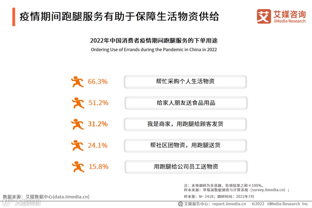 调研数据显示,受疫情影响,消费者使用跑腿服务的频率有所增加。66.3%跑腿服务用于采购个人物资,51.2%给家人朋友送食品用品;还有部分个体经营者,用跑腿给顾客发货,占比31.2%。艾媒咨询分析师认为,出于疫情居家防控需要,跑腿服务在一定程度上有助于保障居民日常生活物资供给。