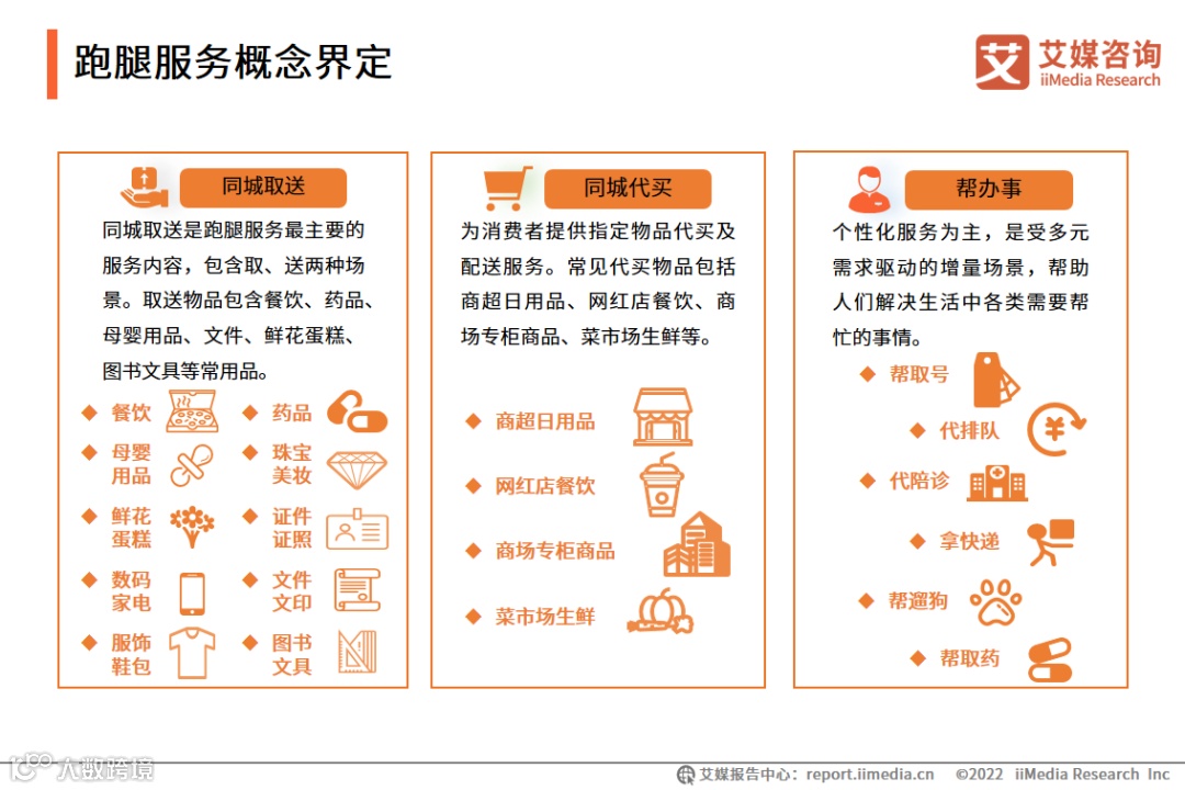 跑腿服务是随即时物流发展出现的非标准化服务,主要满足个人及本地个体经营者的同城配送及个性化需求。即时需求的爆发有益于跑腿经济的进一步发展。从餐饮外卖到零售用品,再到跑腿服务,消费者对消费的时效性要求正在不断提升,而跑腿服务包括同城取送物品、同城代买和帮办事等,能够满足消费者足不出户、节约时间的需求。