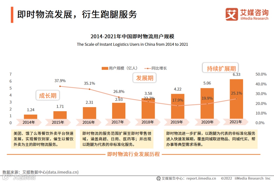 数据显示,2014年到2021年,中国即时物流用户规模从1.24亿人增长到6.33亿人,年复合增长率为26.2%。即时物流的发展可分为三个阶段:成长期、发展期、持续扩展期;从最初依托餐饮外卖场景出现并快速发展,服务范围逐渐从餐饮扩展至商超、日用、医药等零售品类,并进一步向非标准化服务扩展。当前,跑腿服务已成为即时物流衍生出的新服务形式。