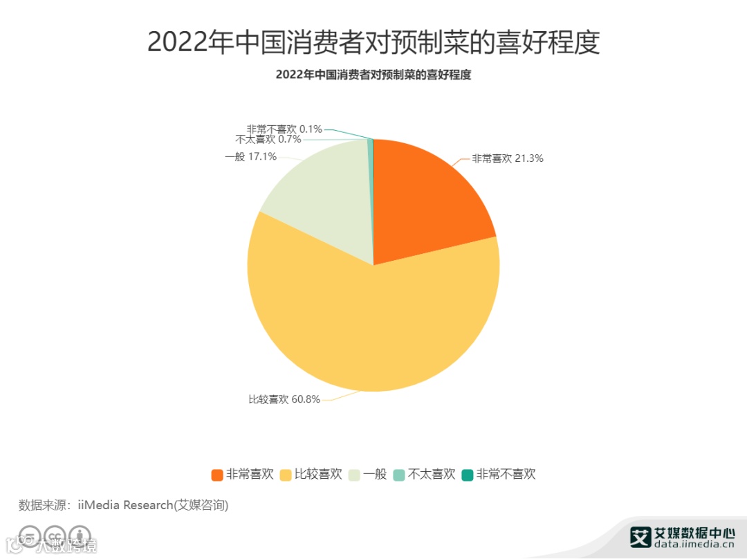 相比起“现炒现吃”,“免洗免切”这样简单快捷的方式更符合人们的第一选择。艾媒咨询数据显示,2022年有超八成的中国消费者对预制菜表示喜欢,但仍有近两成的消费者表示对预制菜感觉一般或者不喜欢。