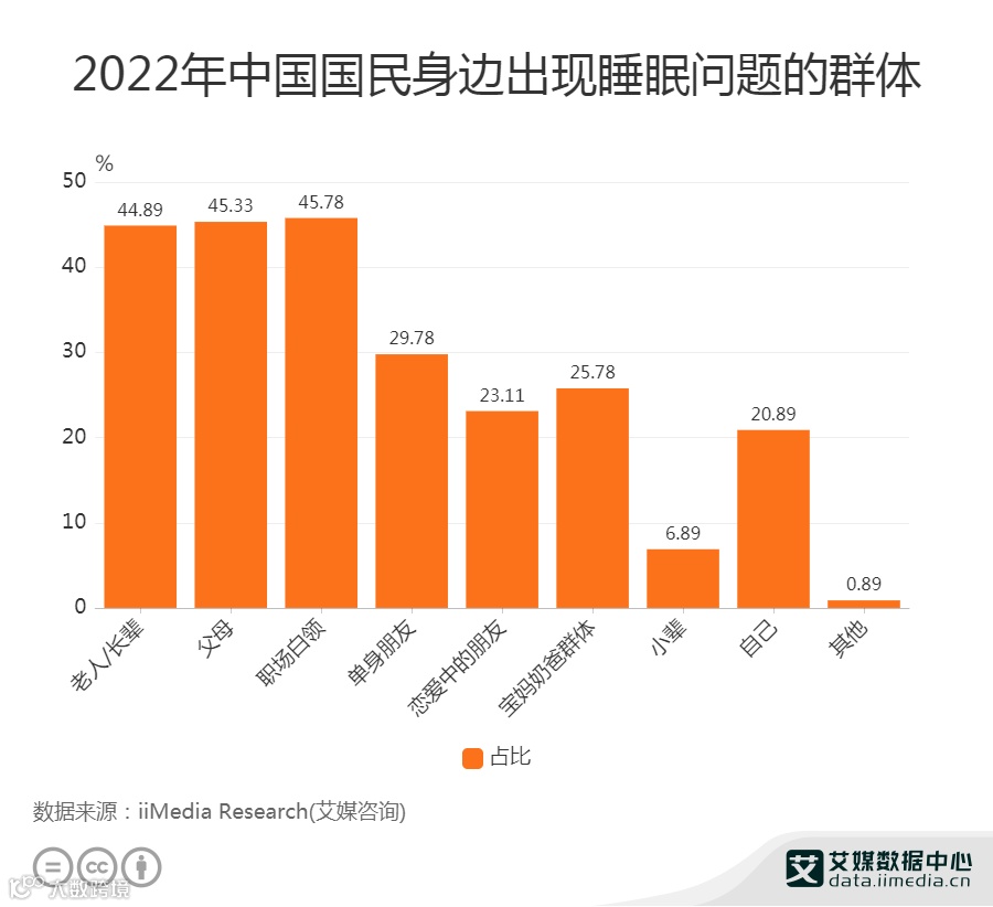 调研数据显示,在出现睡眠问题的群体里,职场白领占比最多,为45.78%,即使是大家认为早睡早起、睡眠规律的老人,也面临着睡眠健康问题,占比44.89%。其中以90后、95后、00后为代表的年轻群体的睡眠问题最为突出。