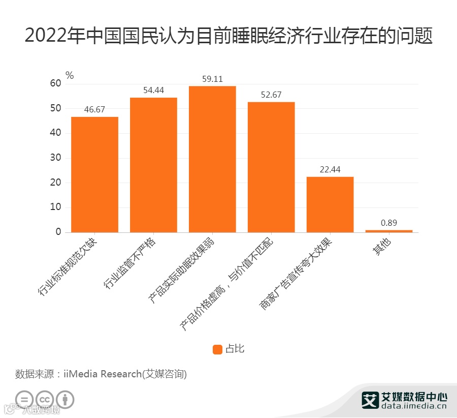 调研数据显示,中国国民认为睡眠经济行业存在的问题主要是产品实际助眠效果弱和行业监管不严格,分别占比59.11%和54.44%。当前中国睡眠经济发展首要挑战在于大多数助眠产品的技术仍未成熟,并且缺乏足够的临床数据验证,导致助眠效果较弱,对改善用户睡眠的实际效果难以衡量,制约了助眠产品的更新迭代与睡眠经济的长久发展。而作为新兴经济,行业门槛低、产品质量差是其存在的主要问题。