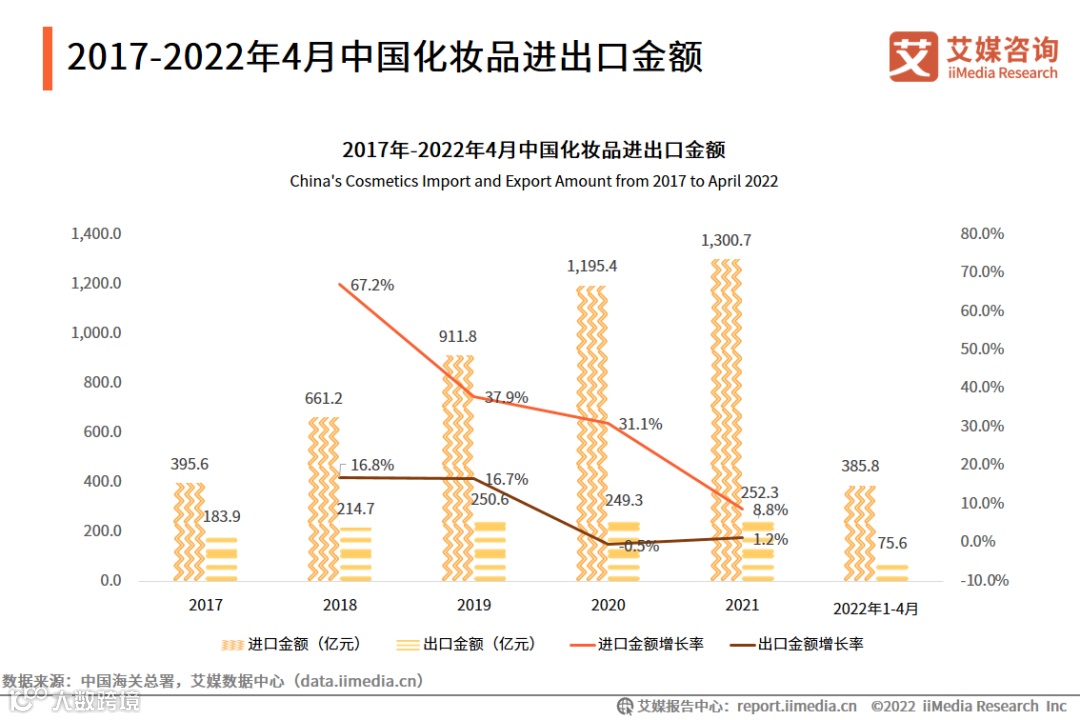 5.2017-2022年4月中国化妆品进出口金额