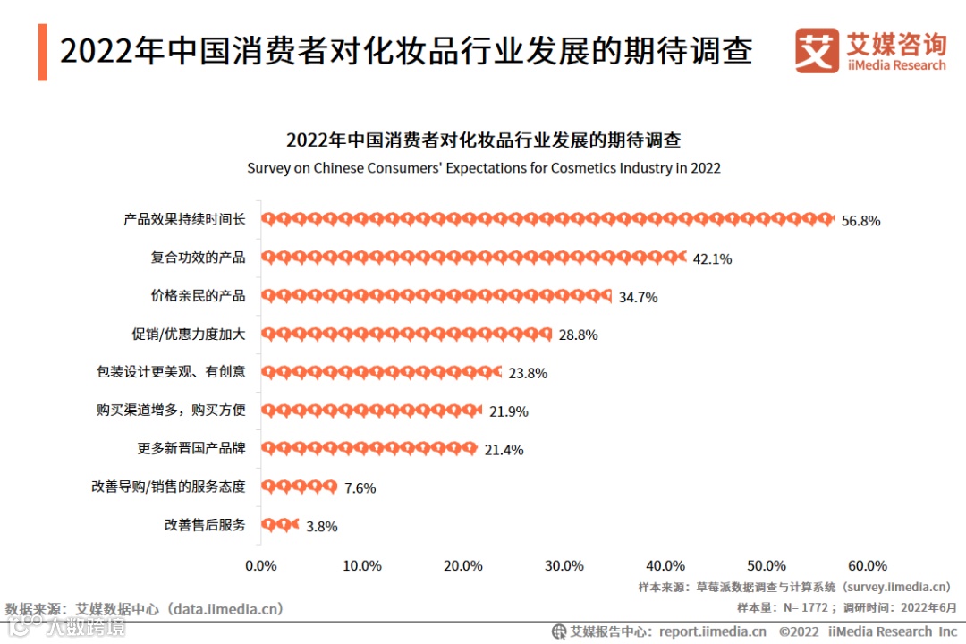 调研数据显示,2022年,中国消费者对化妆品行业发展最期待的是产品效果持续时间延长(56.8%),其次分别是更多复合功效的产品(42.1%)以及更多价格亲民的产品(34.7%)。艾媒咨询分析师认为,相比于价格和促销,消费者更看重产品质量,效果优良且多元的产品将赋予品牌新的增长空间。