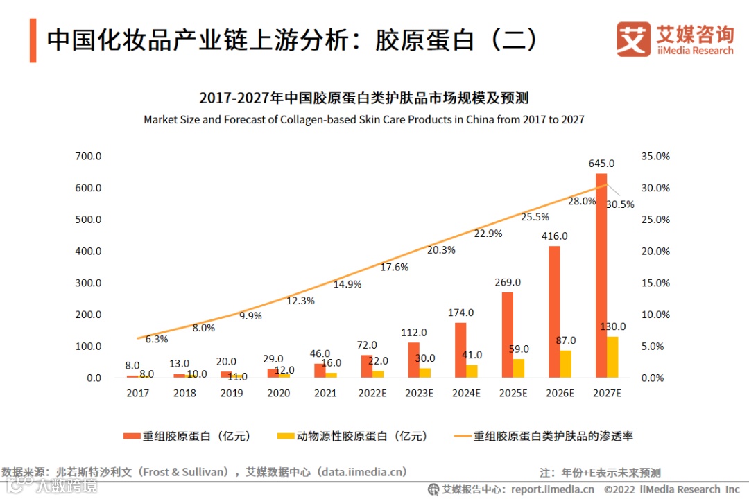 数据显示,2017年至今,中国胶原蛋白类型的护肤品市场规模持续扩大。其中,基于重组胶原蛋白的功效性护肤品市场规模,由2017年的8.0亿元扩张至2021年的46.0亿元,并且有望于2022年达到72.0亿元。同时,数据显示,基于重组胶原蛋白的功效性护肤品市场渗透率也在不断提升,预计2027年渗透率可超过30.0%。艾媒咨询分析师认为,重组胶原蛋白及其衍生出的新材料,将继续成为化妆品产业的重要原料,而基于此类原料生产制造的化妆品,将得到进一步的推广普及。