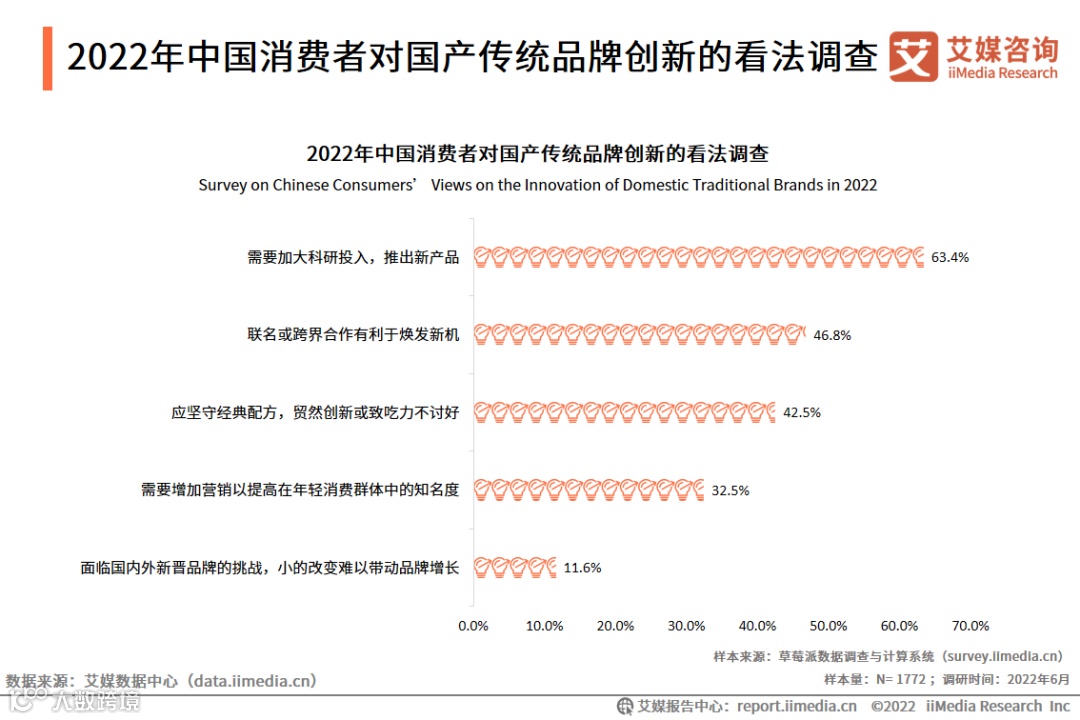 调研数据显示,2022年,63.4%的消费者认为国产传统品牌需要加大科研投入,推出新产品;46.8%的消费者认为联名和跨界合作有利于国产传统品牌焕发生机;但仍有42.5%的消费者表示出对国产传统品牌创新的担忧。艾媒咨询分析师认为,不少国产传统品牌都是以经典单品为人所熟知,与擅长营销的新晋品牌相比,较难实现产品破圈。因此,在产品与营销上同时进行转型创新,是传统品牌取得再增长的关键。