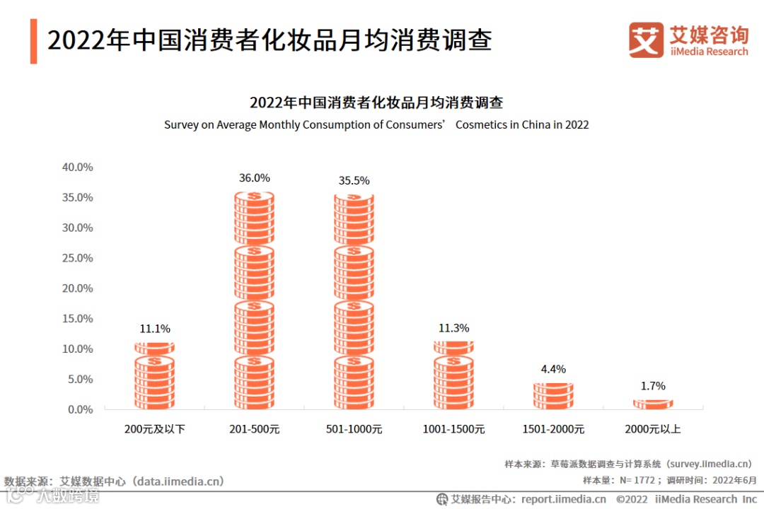 2022年中国消费者化妆品月均消费调查