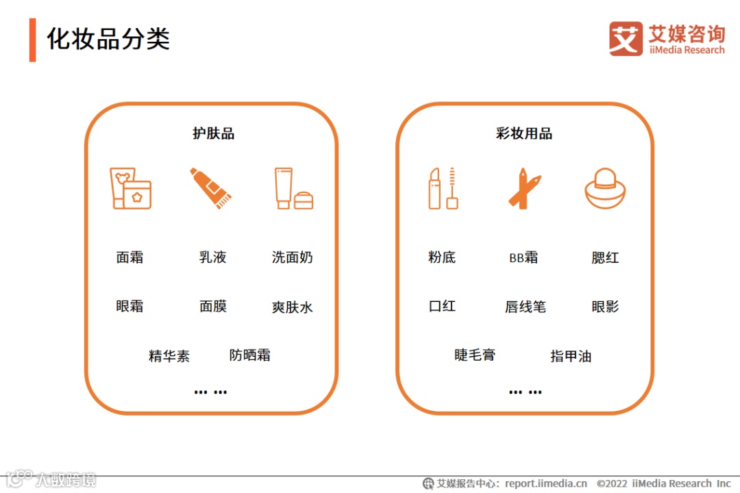 本报告讨论的化妆品主要分为两大类:护肤品(如面霜、乳液、洗面奶及其附属工具等),彩妆用品(如粉底、BB霜、腮红及其附属工具等)。