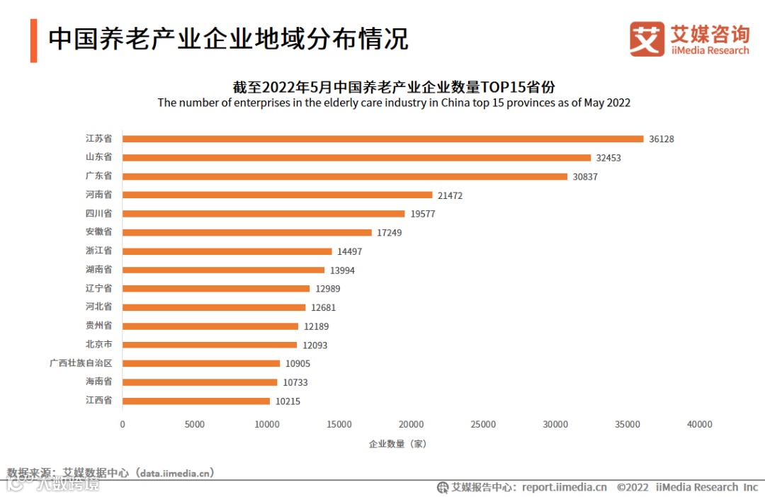 养老产业关注度的日渐提升,吸引了大量企业布局。艾媒咨询数据显示,截至2022年5月,中国养老企业数量共有367083家,其中有三个省份企业数量突破30000家。江苏省养老企业数量在各省份中排名第一,共有36128家,其次是山东省32453家,广东省30837家。