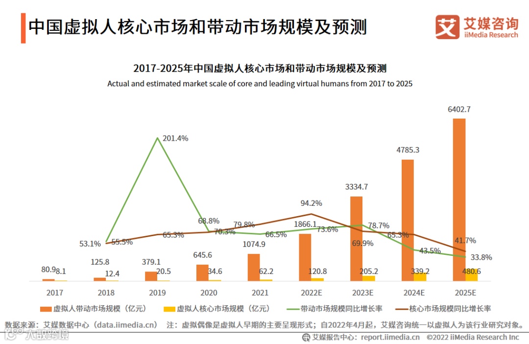 艾媒咨询发布的《2022-2023年中国虚拟人行业深度研究及投资价值分析报告》显示,2021年,中国虚拟人带动产业市场规模和核心市场规模分别为1074.9亿元和62.2亿元,预计2025年分别达到6402.7亿元和480.6亿元,虚拟人产业保持稳定增长态势。