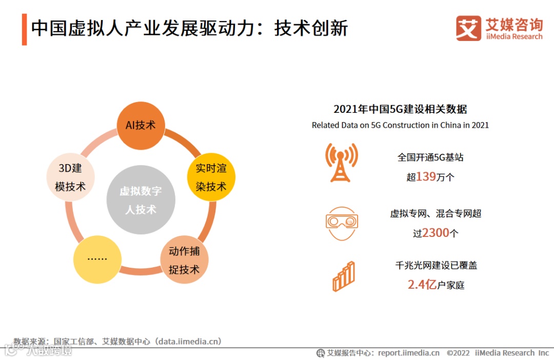 此外,虚拟人产业的发展涉及众多技术领域,涵盖AI技术、实时渲染技术、3D建模技术以及动作捕捉技术等。数据显示,2021年,中国开通5G基站超139万个。5G技术的创新,以及虚拟现实技术的提升进一步推动了中国虚拟人产业发展。