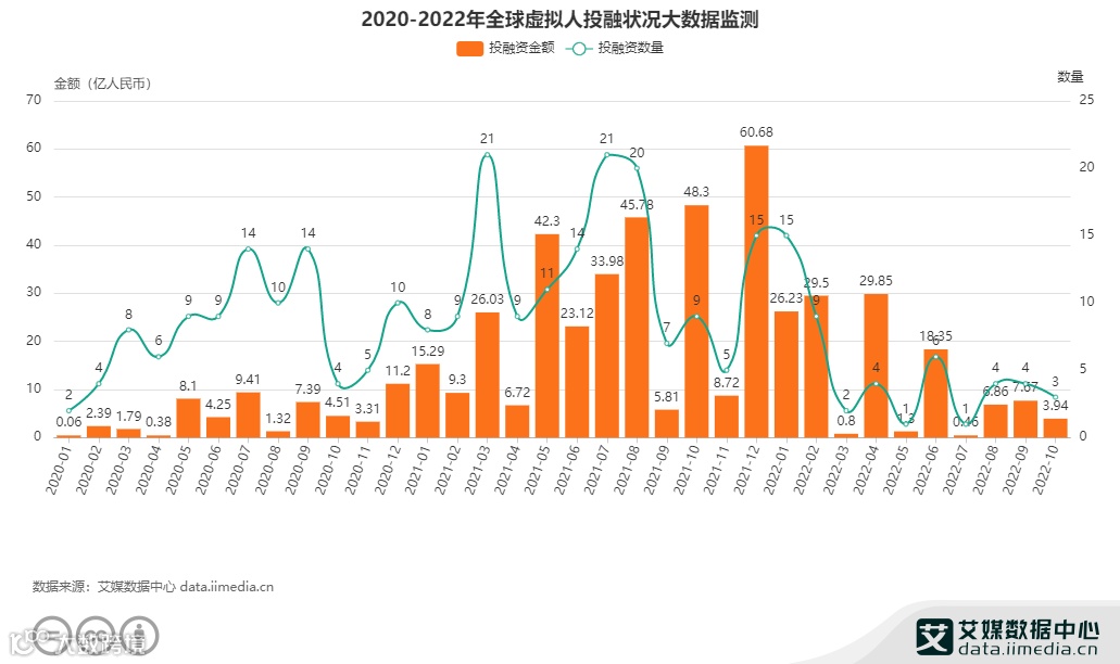 数据显示,2020年全年涉及虚拟人领域的投融资案例95起,总金额约54.11亿元;2021年涉及投融资案例149起,总金额约326.03亿元;截至2022年10月,虚拟人领域投融资案例49起,总金额约124.96亿元。2021年较前几年单笔融资额度和融资总金额都大幅度增加,在政策利好背景下,2022年保持上年的资本高涨热度。
