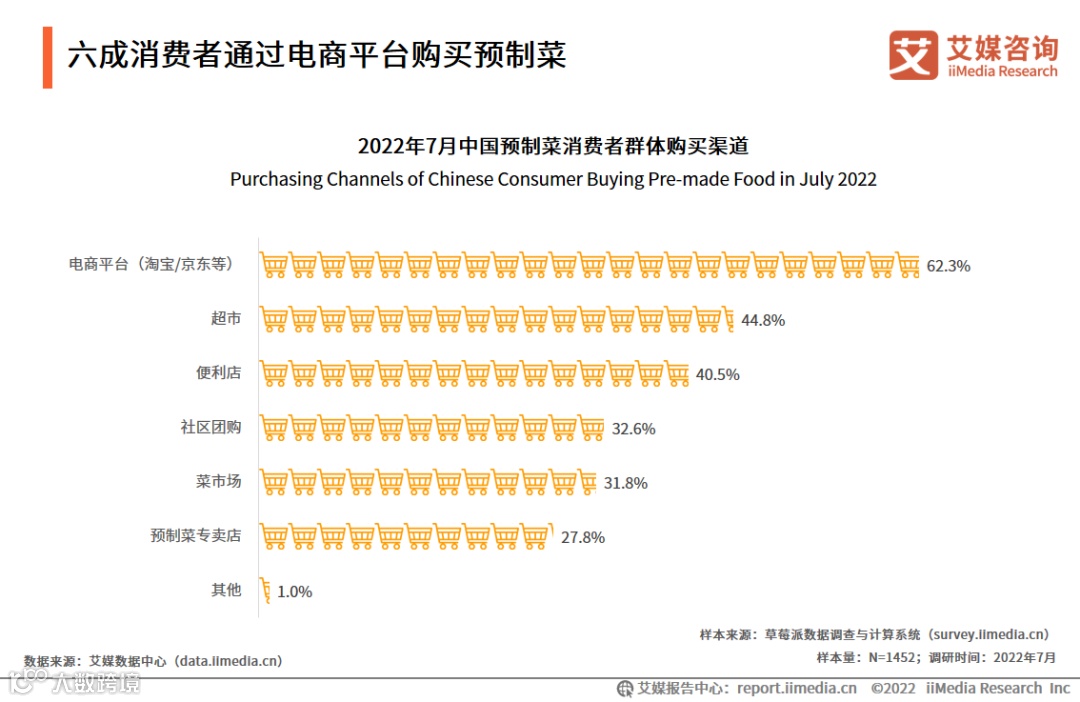 2022年7月调研数据显示,消费者购买预制菜主要通过电商平台(62.3%)和超市(44.8%)。艾媒咨询分析师认为,预制菜厂商可以根据消费者购买预制菜的渠道习惯精准投放相应广告进行宣传,对菜品规格与包装进行相应调整,以达到销售增长的目标。