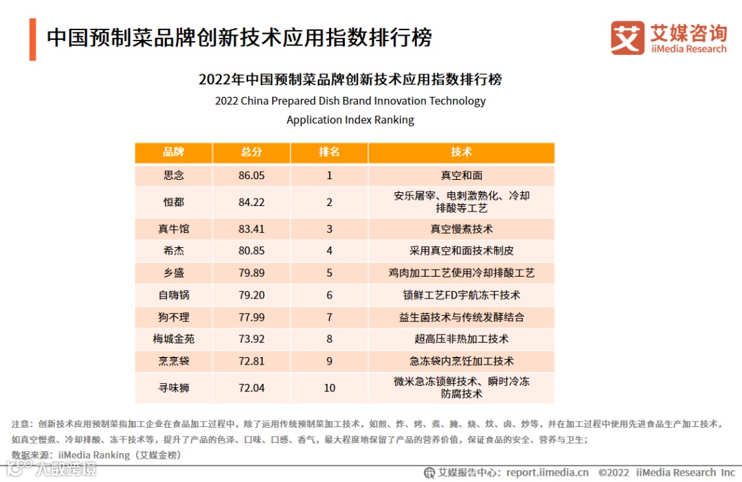 2022年中国预制菜品牌的创新技术排行榜的前十包括思念、恒都、真牛馆等品牌。其中思念以86.05分排名第一,恒都和真牛馆分别以84.22分和83.41分,排名第二、第三。