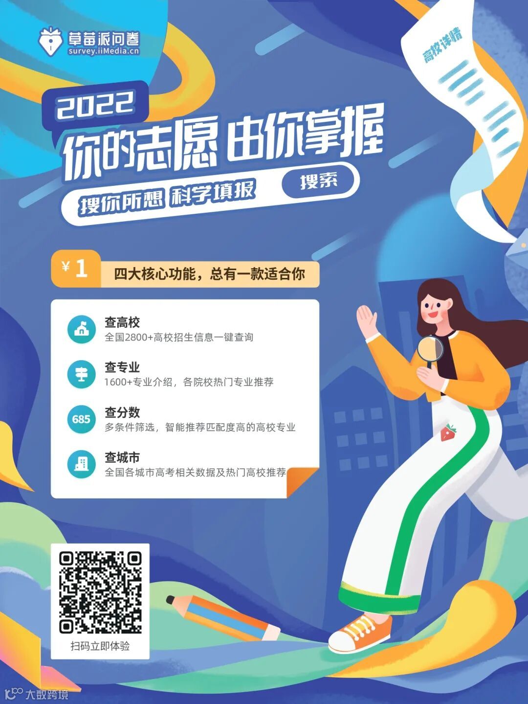 同时,艾媒咨询旗下的调研社区——草莓派问卷全新推出了“高考志愿库”,为各位家长和考生们提供强大的志愿填报数据查询功能,助力考生快速完成数据筛选、学校对比、专业评估等工作,更新更快的获取到高考资讯。包括全国高校招生信息、院校招生计划和招生简章、各省及高校历年录取分数线、专业录取分数线等。