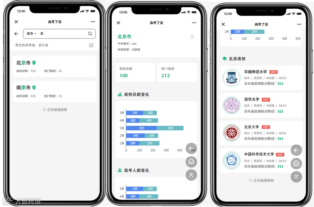 4、查城市:搜索意向就读城市,系统将自动生成该城市高校数量和高考人数变化、热门高校推荐。