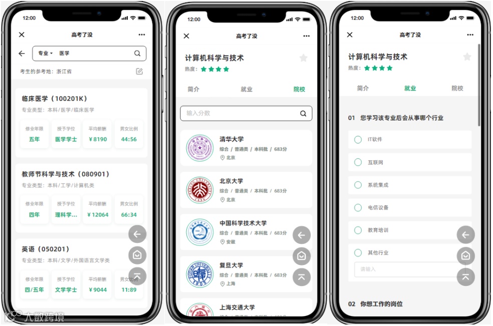 2、查专业:收录1600余个专业,直观了解文史理工各类专业详情、开设院校等数据,还可参与就业意向调查,获取该专业在不同行业和薪资分布的统计数据。