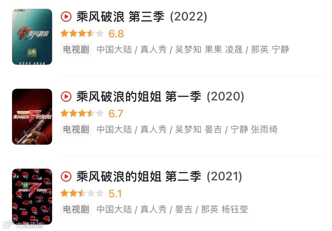 艾媒网(iimedia.cn)了解到的最新消息来是,《浪姐》第三季豆瓣开分为6.8分,大多数观众的评分为3星到4星。该节目第一季开分8.5分,并一度升至9.2分,目前已降到6.7分;而节目的第二季则评分更低,目前仅为5.1分。