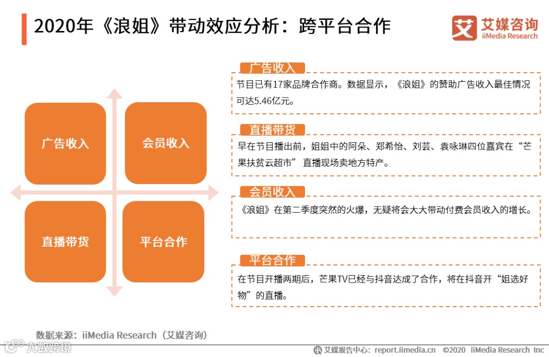 艾媒咨询此前报告指出,《浪姐》系列节目在引流和变现上效果明显。就该系列节目的第一季而言,一方面,明星效应与综艺模式互相成就,引来品牌争相赞助,截至2020年7月,节目已有17家品牌合作商,赞助广告的收入最佳情况达5.46亿元。另一方面,节目的火爆还带动了会员收入的增长,除了正片限时免费,《浪姐》的加更、花絮及衍生节目都是需要VIP的,不少观众为此开通会员。