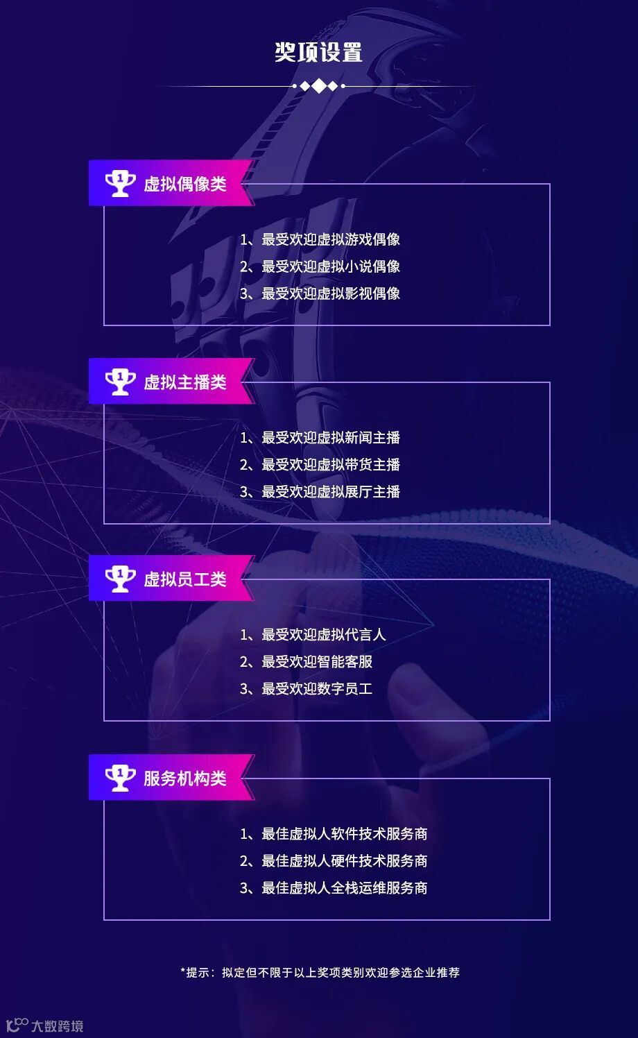 本次评选涵盖四大类目,一是虚拟偶像类,评选最受欢迎的虚拟偶像IP;二是虚拟主播类,评选最受欢迎的虚拟主播IP;三是虚拟员工类,评选最受欢迎的虚拟员工IP;四是服务机构类,评选最佳虚拟人技术服务。