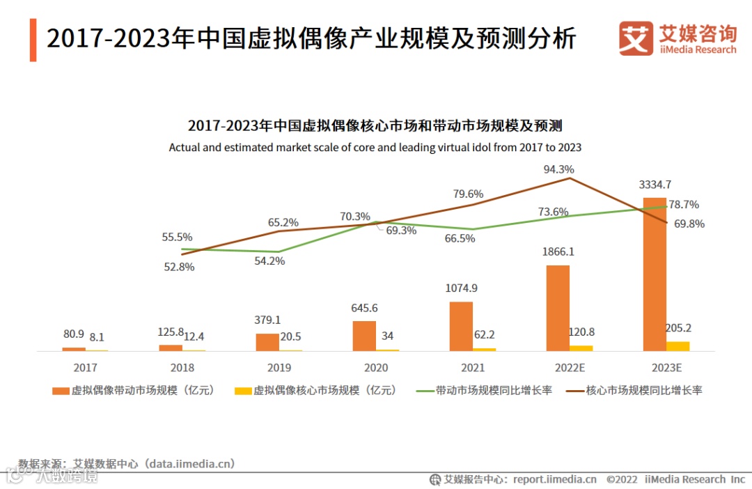 iiMedia Research(艾媒咨询)数据显示,虚拟偶像产业保持稳定增长态势,2021年,虚拟偶像的带动市场规模和核心市场规模分别为1074.9亿元和62.2亿元,预计2022年将分别达到1866.1亿元和120.8亿元。