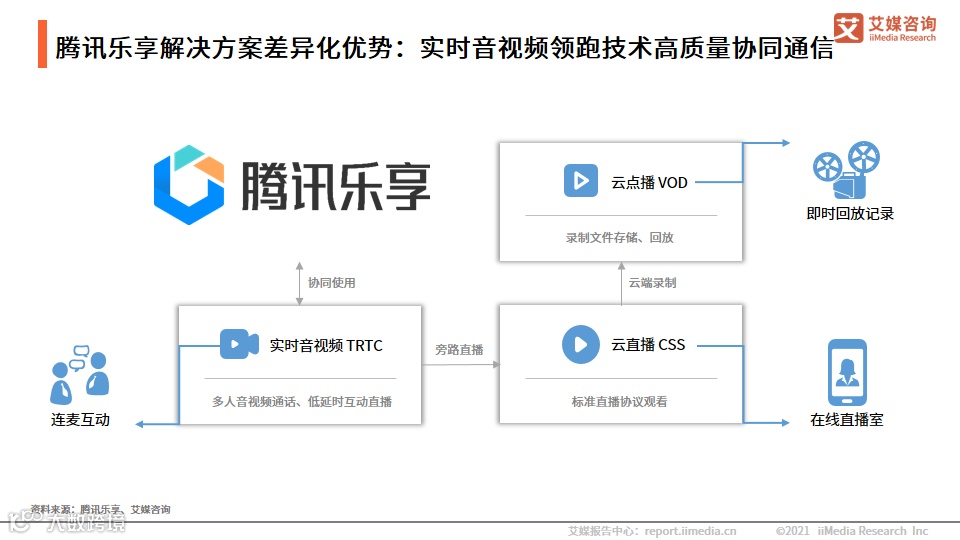 腾讯实时音视频TRTC技术主打全平台互通的多人音视频通话和低延时互动直播解决方案。通过腾讯云不同产品间的相互联动,能简单快速地将实时音视频 TRTC 与云直播 CSS、云点播 VOD 等云产品协同使用,扩展腾讯乐享协同通信版块的多元功能场景。腾讯乐享的在线直播室、连麦互动、即时回放记录等功能便是基于腾讯实时音视频 TRTC 等技术,打造企业培训过程中高质量低延时的优质协同通信体验。