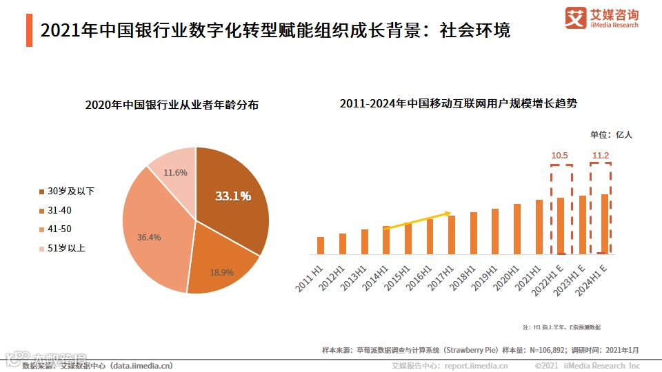 《十四五规划纲要》提出“发展数字经济、推进数字产业化和产业数字化,推进数字经济和实体经济深度融合”意见,要完善金融支持创新,促进新技术产业化和规模化。iiMedia Research(艾媒咨询)数据显示,2022年上半年个人移动手机银行渗透率预计达75%,2024年上半年中国移动互联网用户规模预计达11.2亿人。移动互联网用户的增加,加速了数字化银行的形成和普及,为中国银行业数字化转型赋能组织成长的需求和发展提供了土壤。