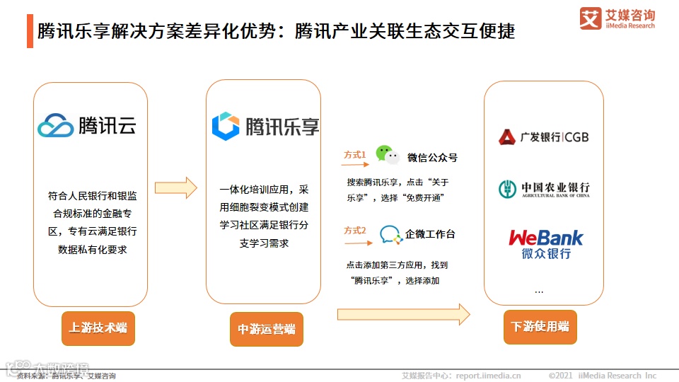 腾讯乐享区别于其他数字培训应用的重要优势之一在于腾讯系列上下游数字化应用生态的完整性和关联性;腾讯云为上游数据处理端解决银行数据私有化部署,腾讯乐享为平台端打造银行社区型学习平台;腾讯社交应用端快捷的链接方式能有效提升使用端用户的友好使用度,减少用户应用间切换的摩擦损耗。