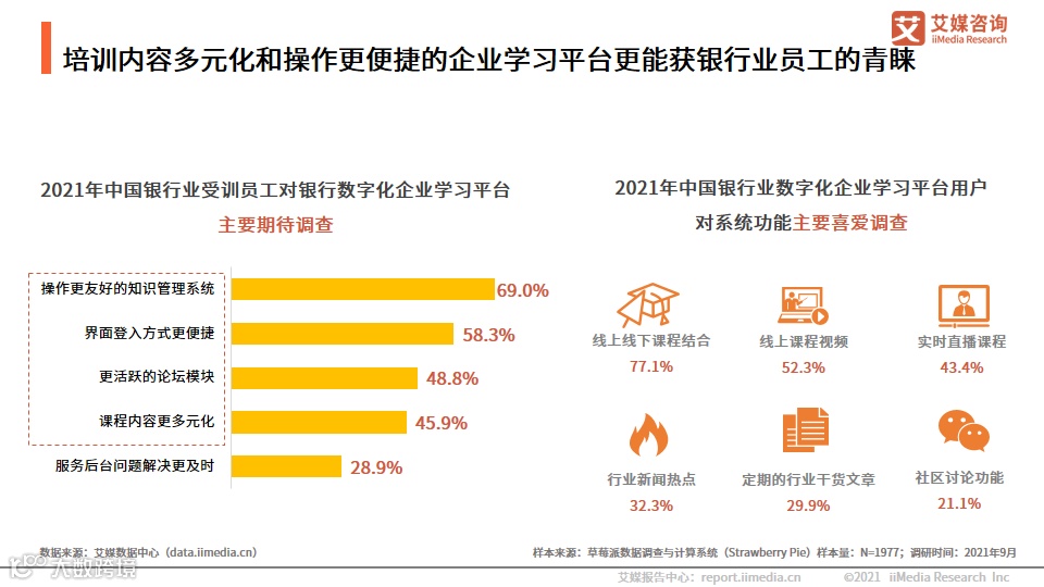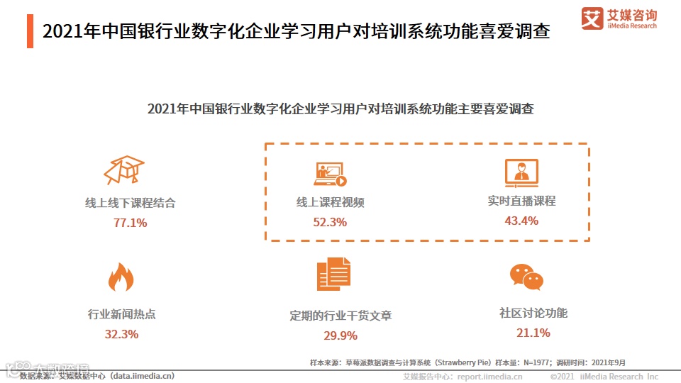 iiMedia Research(艾媒咨询)数据显示,近五成银行员工表示期待更活跃的论坛模块和更多元化课程内容;超五成银行员工表示,操作更友好的系统以及更便捷的登入方式值得期待;在系统功能喜好调查中,显现出多形式功能布局态势。在中国银行业企业高管的定性调查中发现,数字化企业学习系统的数据安全保障是最大的考虑因素,占87.1%;企业上云过程是否存在数据迁徙丢失风险占76.9%;数字化企业学习解决方案的性价比考虑因素占75.6%。