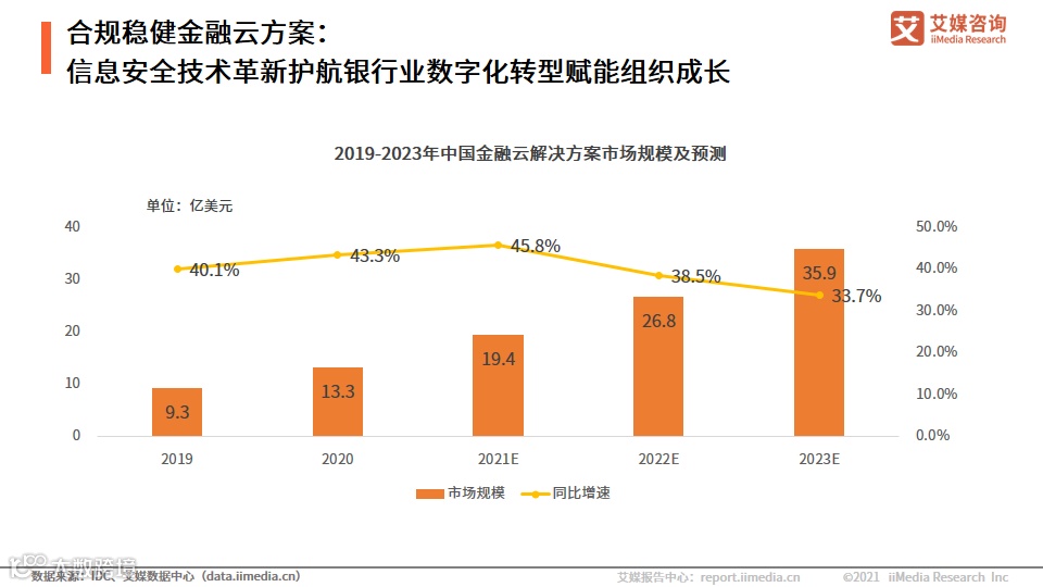 数据显示,2019-2023年中国金融云解决方案市场复合增长率为 40.2%,2023年市场规模预期达到35.9亿美元。银行作为金融机构的中流砥柱,云解决方案正成为银行数字化转型中的重要技术支撑。金融机构以银行为代表,对信息技术革新的要求相比于其它类型企业更追求稳健,监管更严格。艾媒咨询分析师认为,具备合规性和稳健的金融云解决方案将成为数字化企业学习平台供应商进入中国银行业的基础门槛。