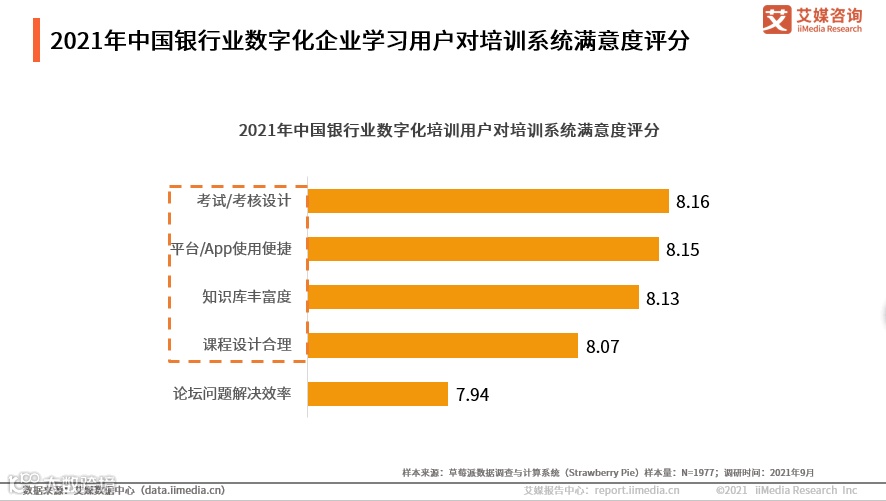 2021年中国银行业数字化企业学习用户对培训系统满意度评分